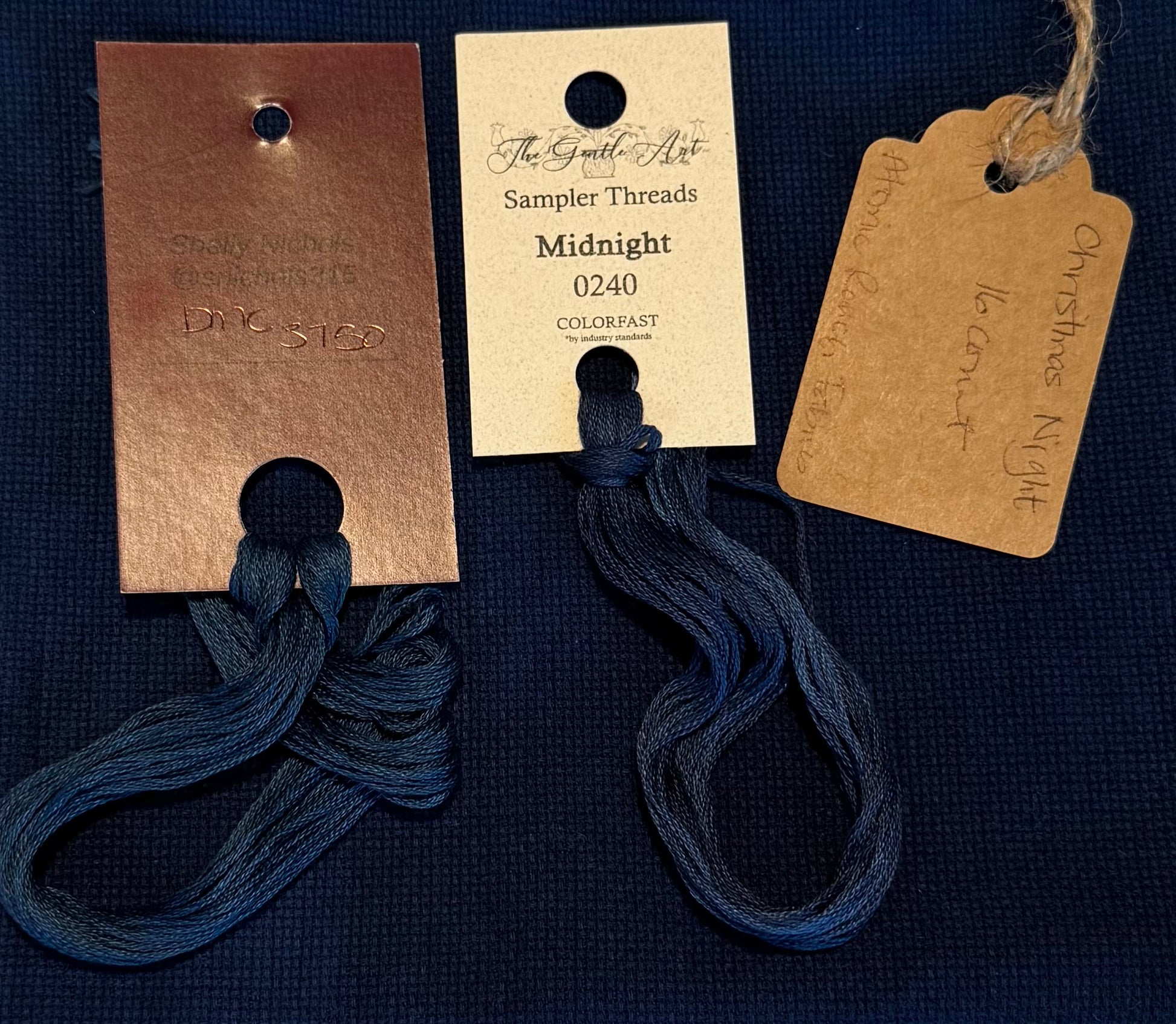 This color is a vibrant navy. It captures the night sky with natural night. The fabric is mottled. Floss colors closely resembling the linen are DMC #3750 and Gentle Arts Midnight.