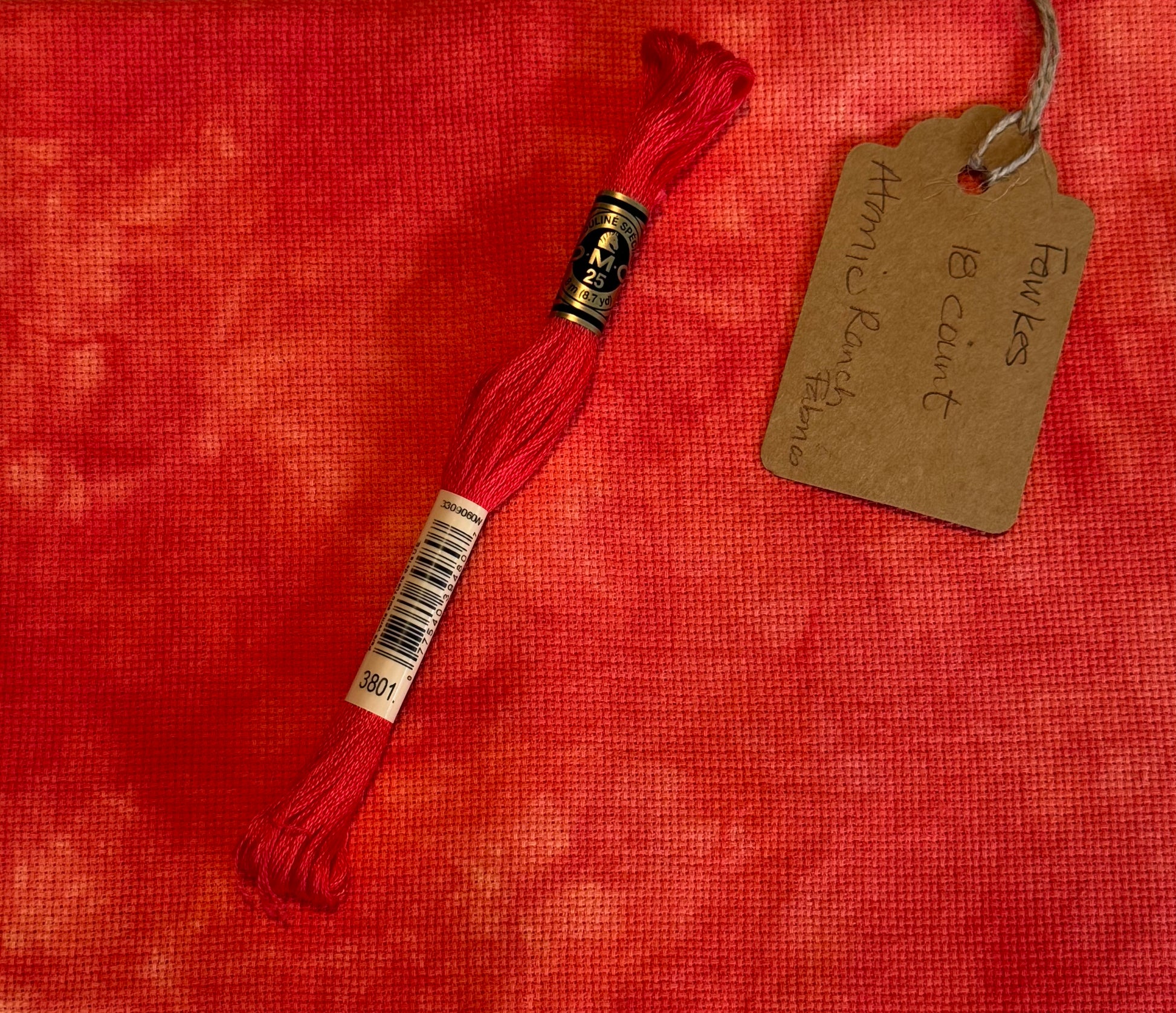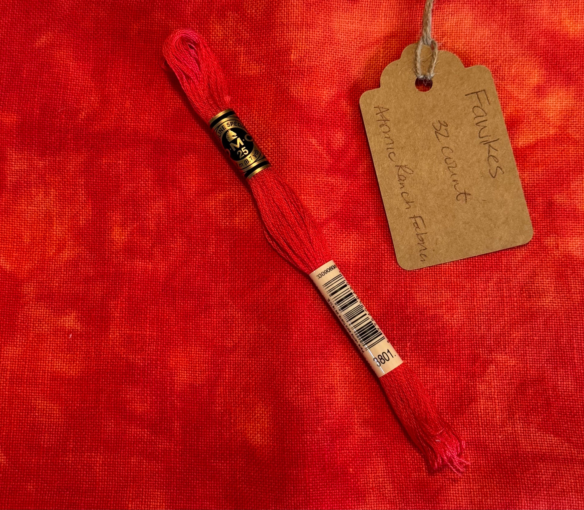 This color is a mottled red.  The fabric is mottled.  Floss colors closely resembling the linen are DMC #3801.
