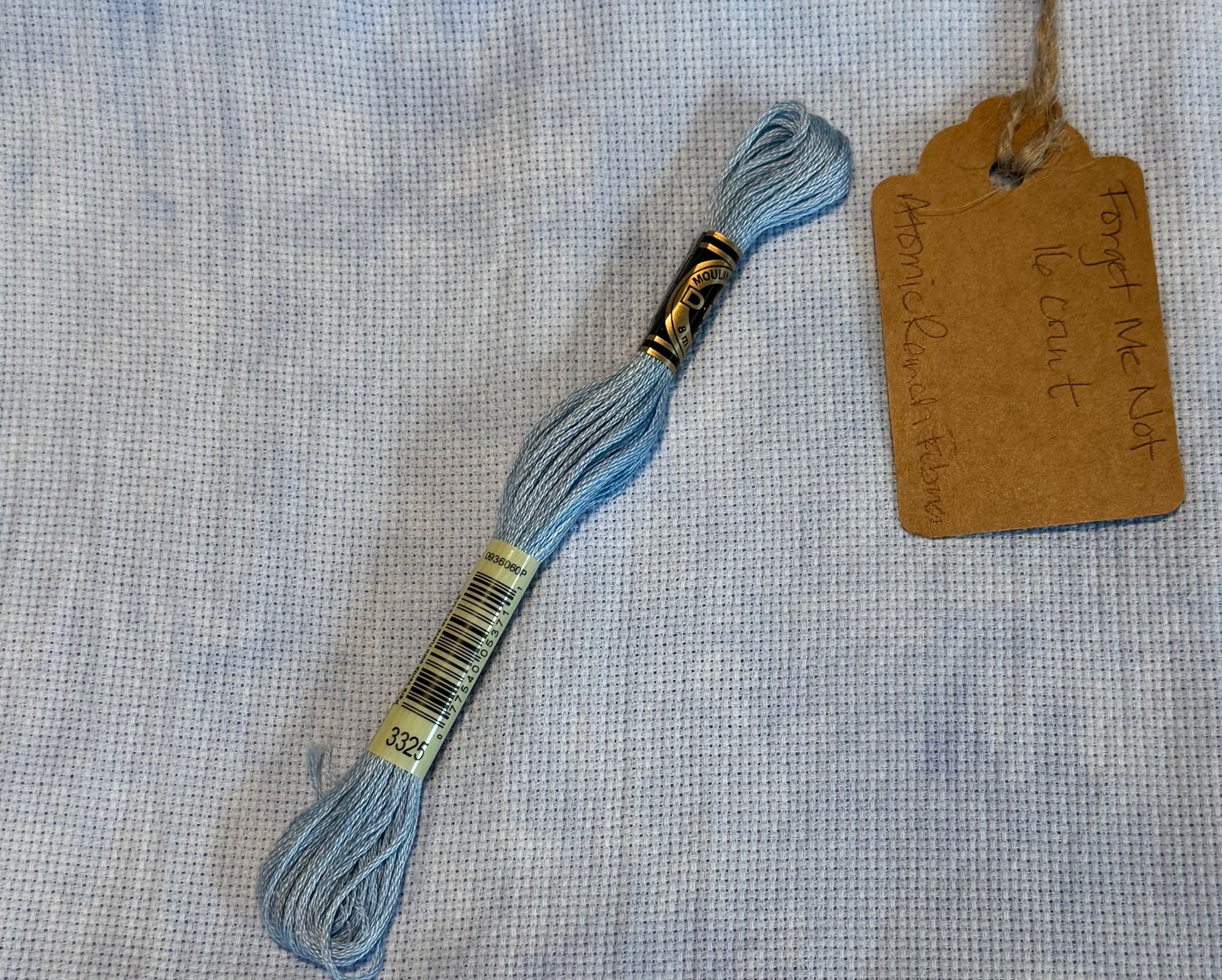 This color is a mottled light blue. It captures the grey hue of a sky on a new Spring morning. The fabric is mottled. Floss colors closely resembling the linen are DMC #3325