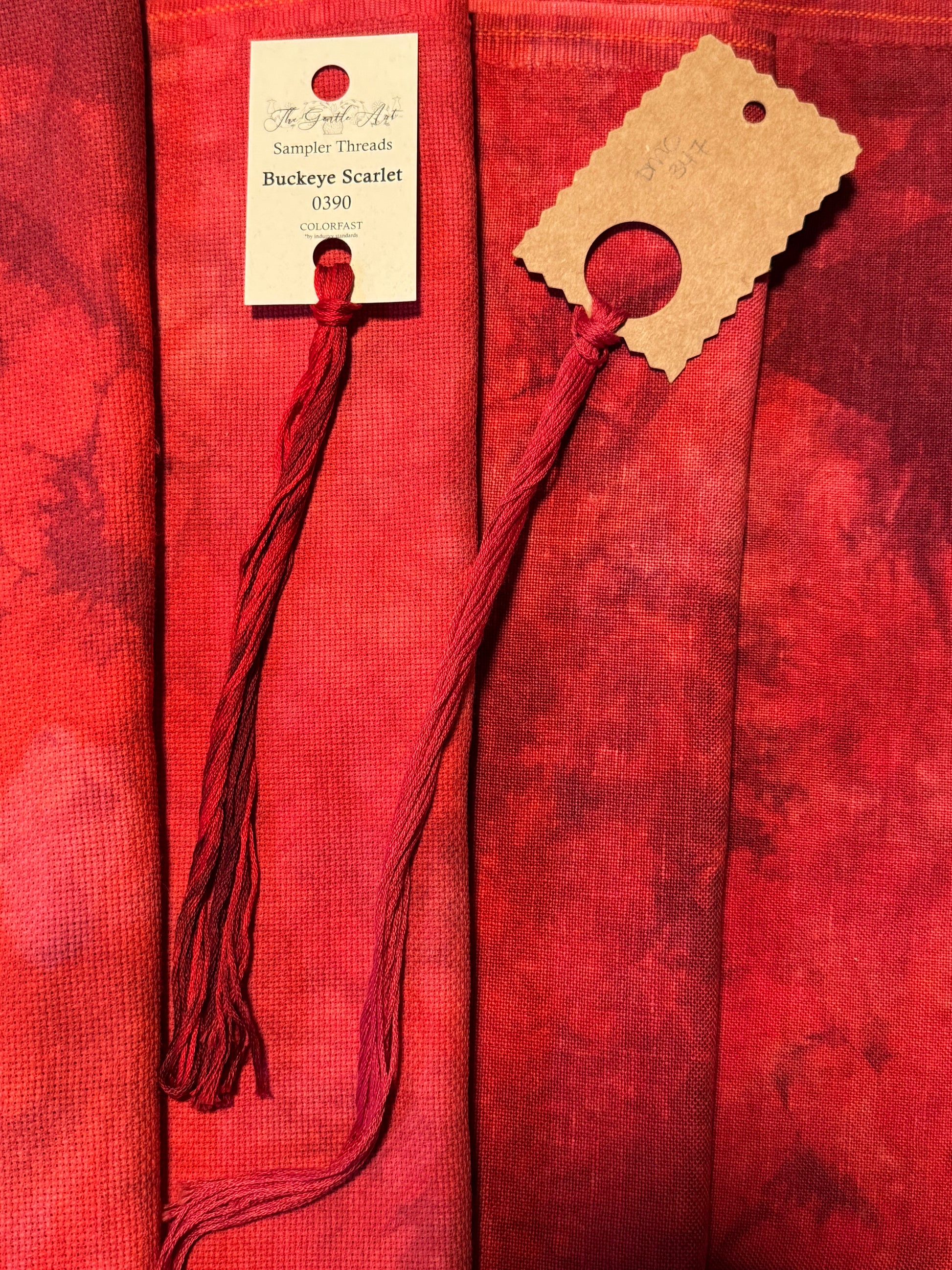 This color is a mottled red.  The fabric is mottled.  Floss colors closely resembling the linen are DMC #347 or Gentle Art Buckeye Scarlet.
