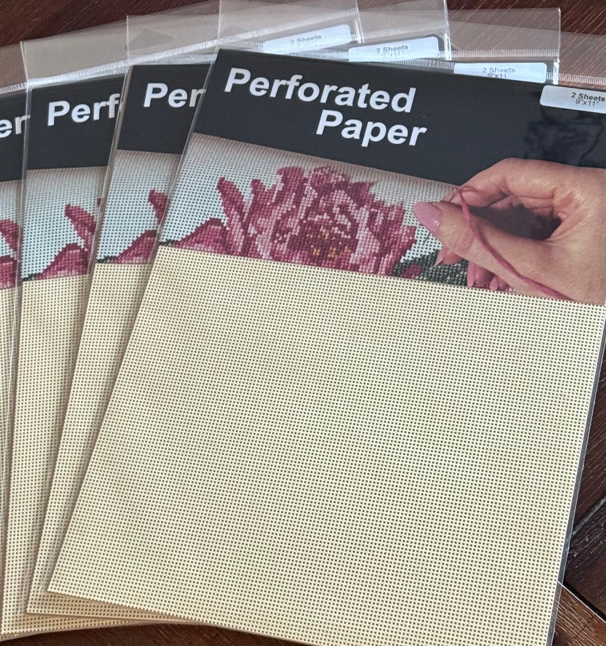 Perforated Paper is 14 stitches per inch and is ideal for a variety of craft and needlework projects. Its uses are only limited by your imagination. Use three strands of floss and a size 24 tapestry needle. The paper can be easily cut with scissors but resists tearing. Wrinkles can be ironed out with a warm iron