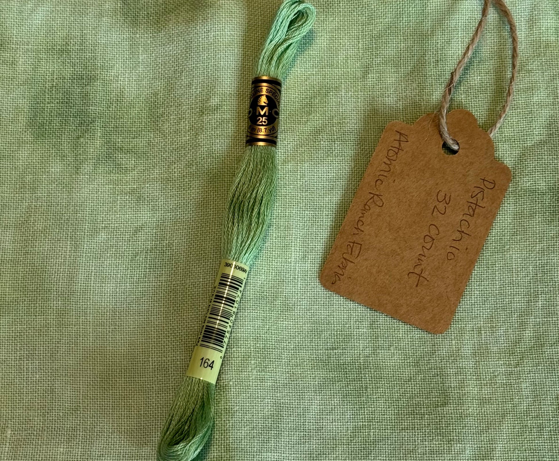 This color is a mottled mint green.  The fabric is mottled.  Floss colors closely resembling the linen are DMC #164