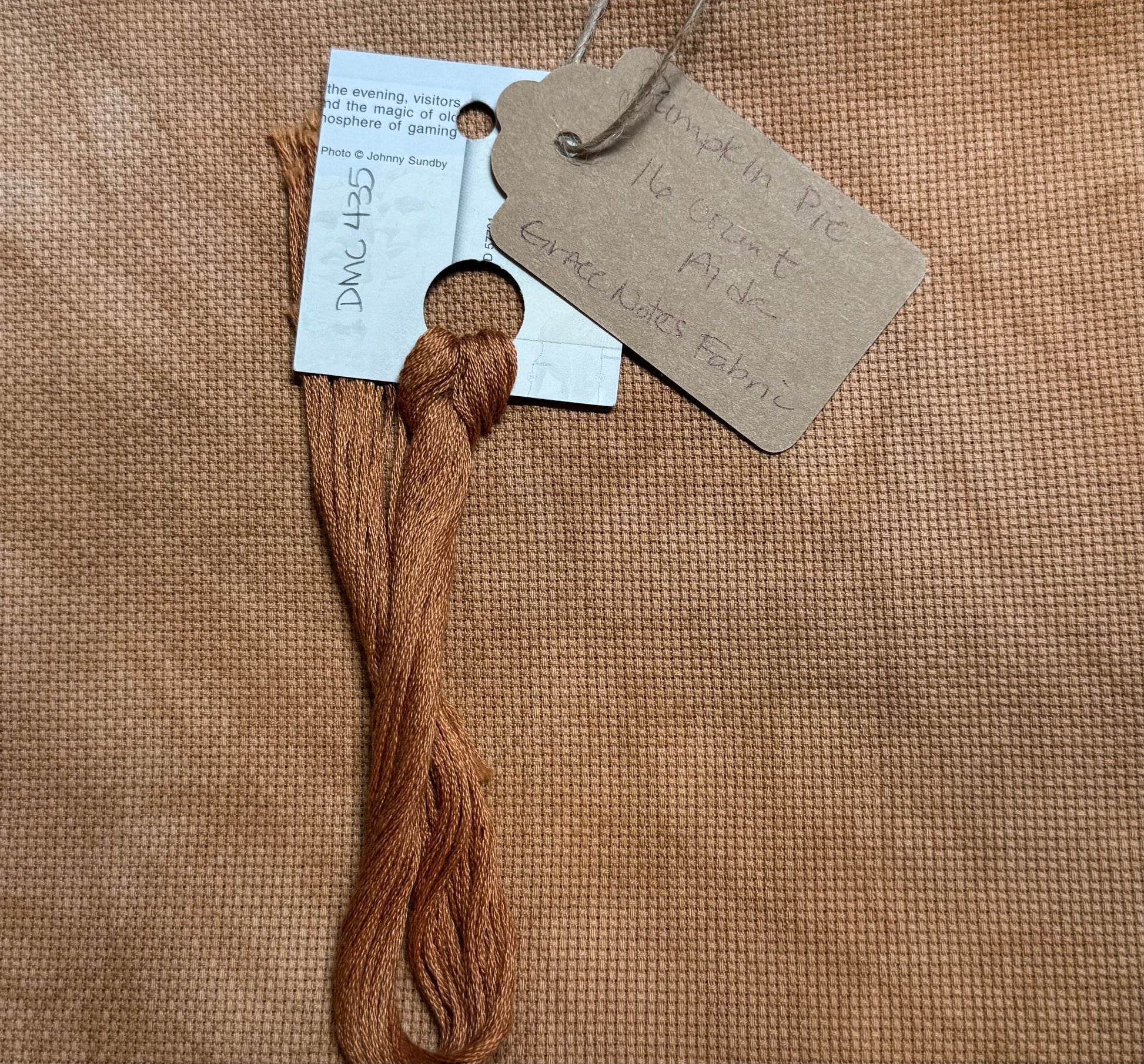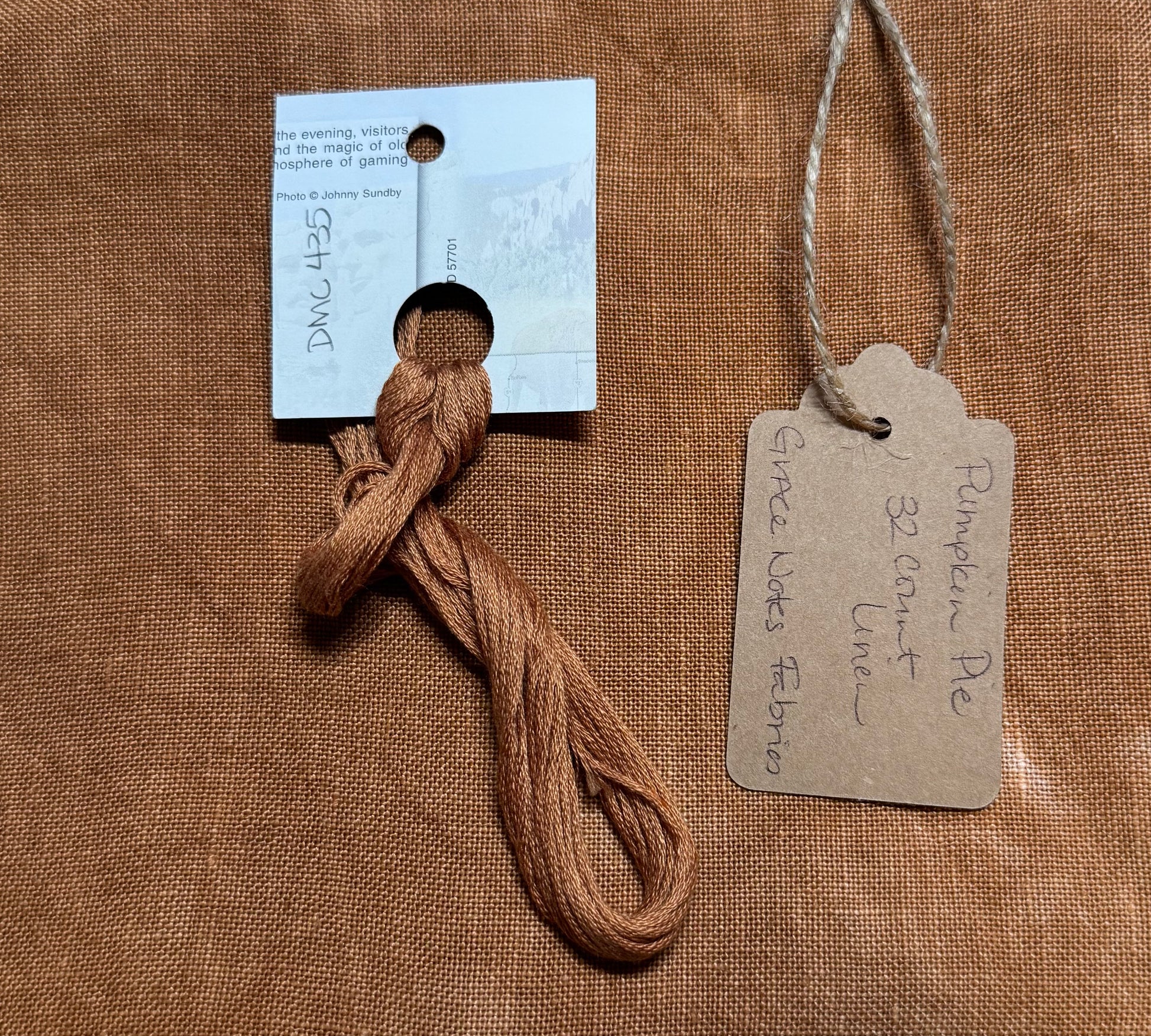 This color is a mottled dark orange. It feels like a pumpkin pie! The mottling makes each piece unique, but not in your face bold. Floss colors closely resembling the linen are DMC #435.