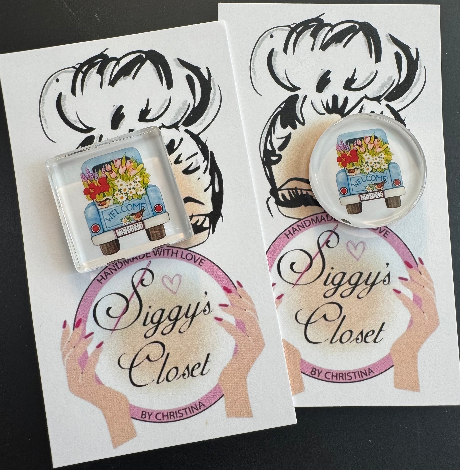 Spring truck needle minder are perfect for those flower lovers. The truck bed is filled and holds extra details with a Welcome Spring message. Christina makes the perfect 1 inch square or circular needle minder.
