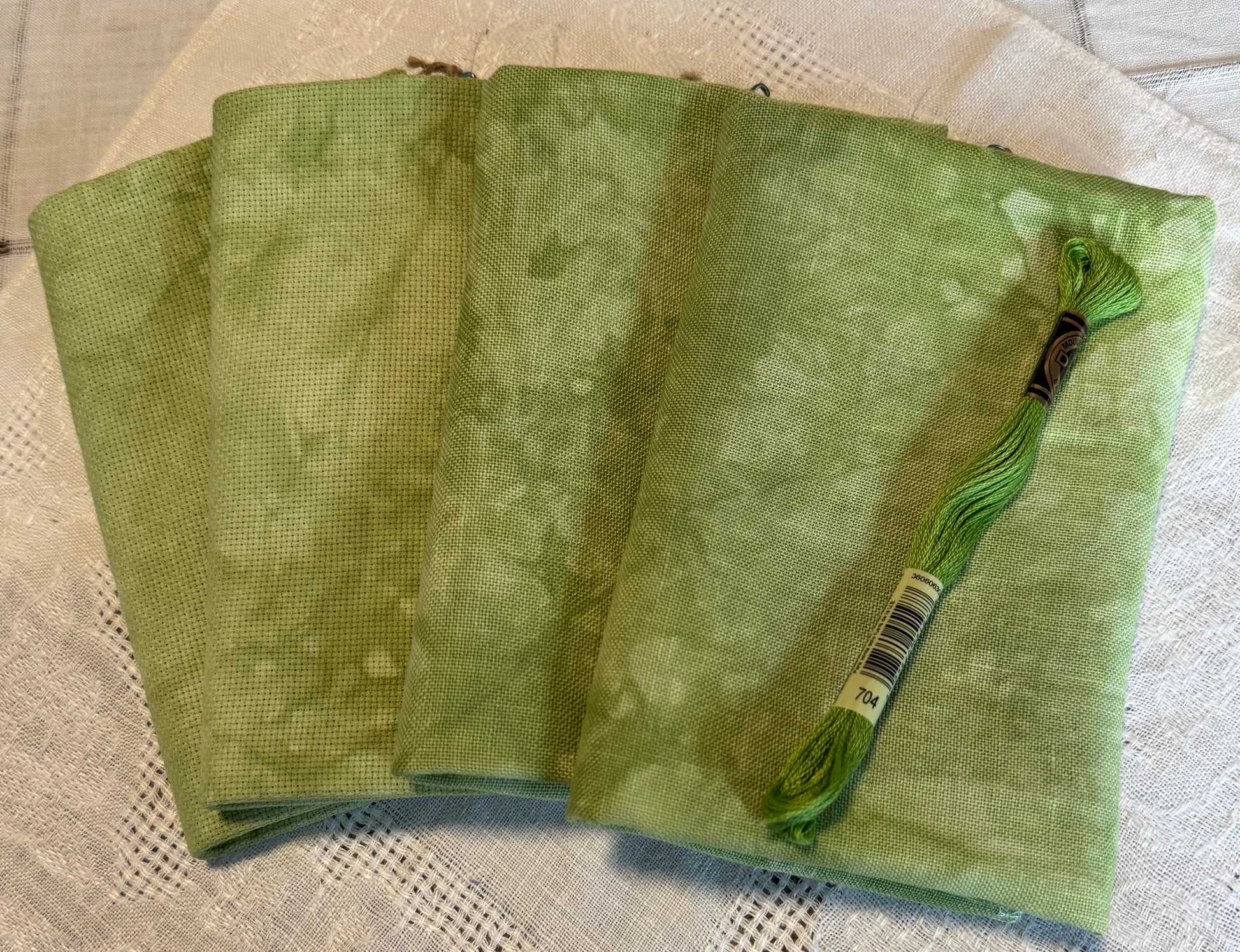 Every piece is hand dyed, and though the same formula and process is replicated with any dying process, each piece is unique.  Linen and Aida are cut to a Stitcher's Quarter Yard, approximately 17" x 28".  Size is approximate due to the the dye process.