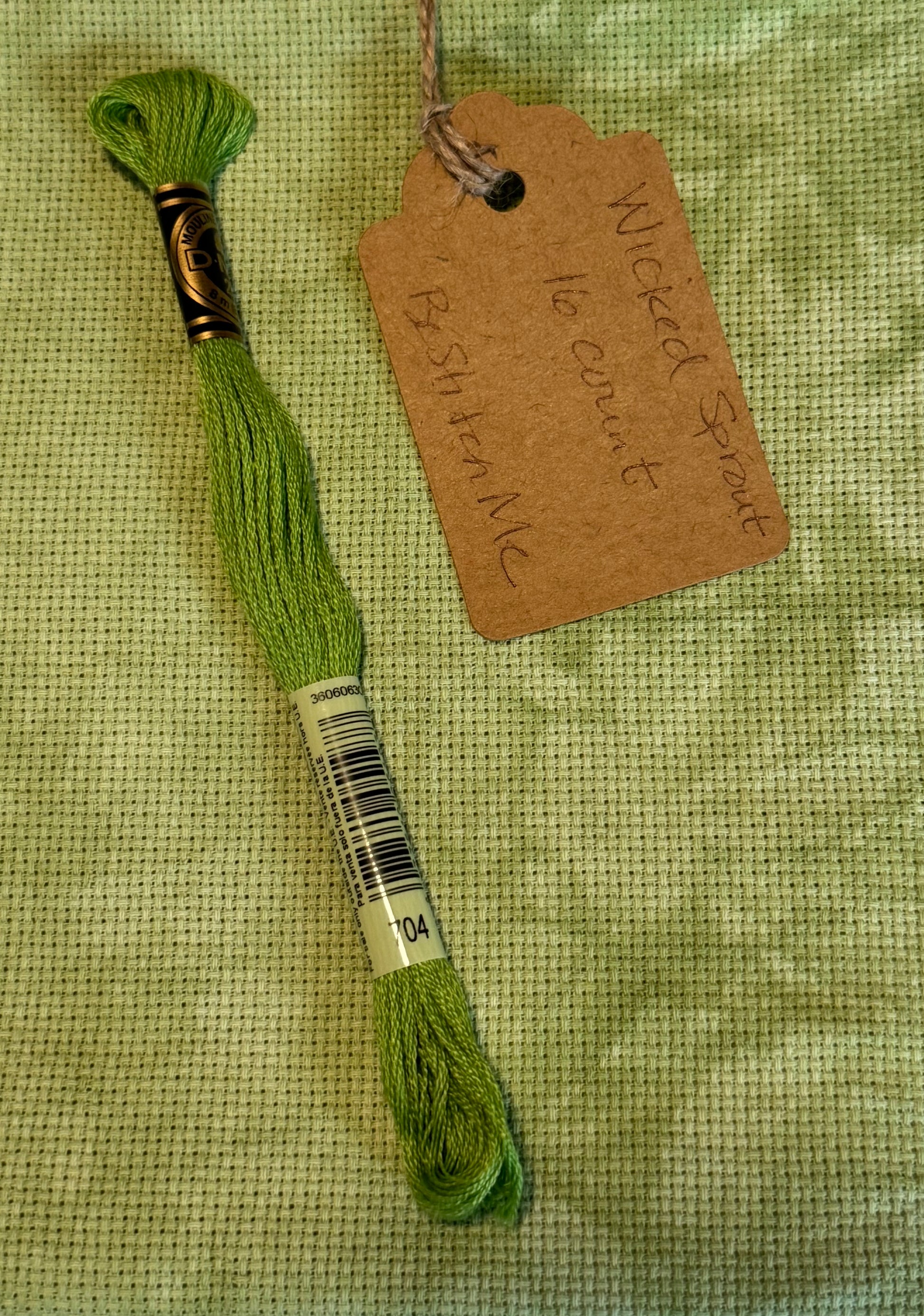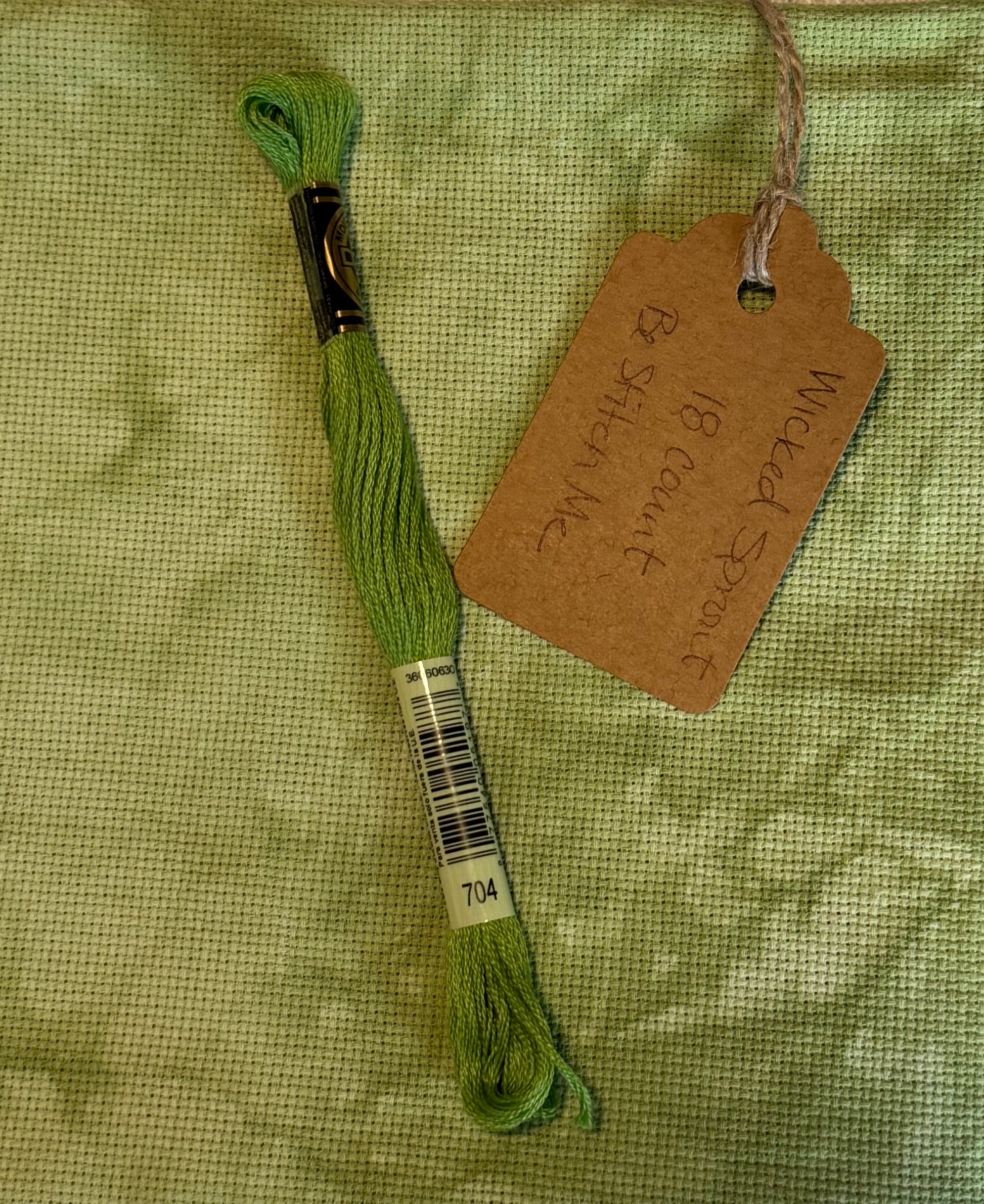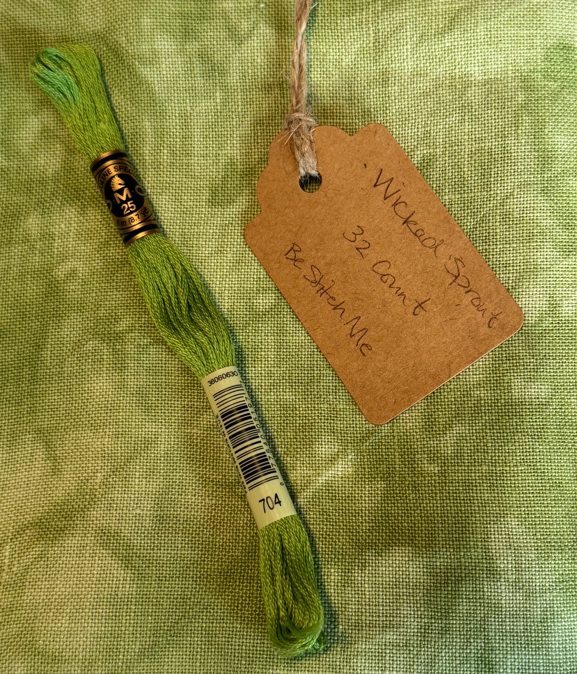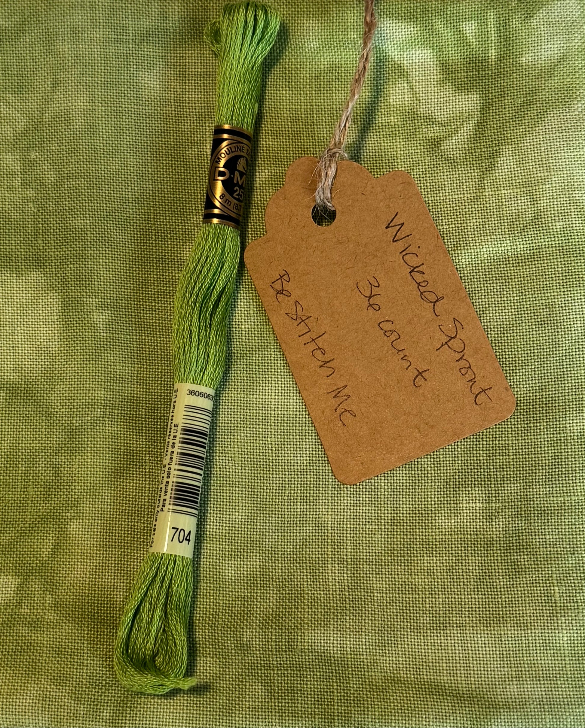 This color is a mottled green.  The fabric is mottled.  It is the perfect green to stitch cute Halloween or new Spring! Floss colors closely resembling the linen are DMC #704